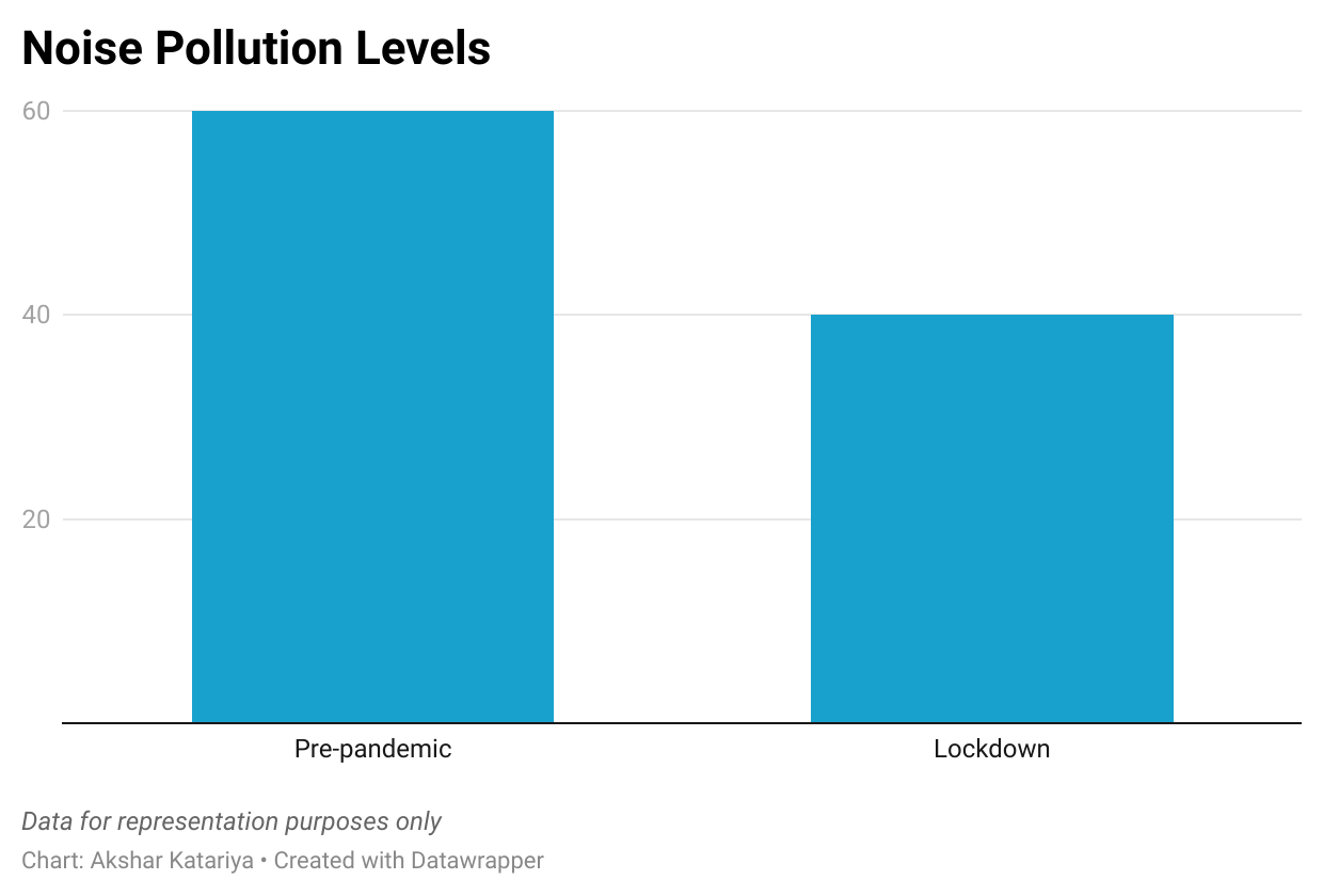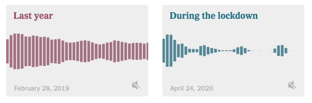 For example, Figure 1 below shows noise pollution in decibels before and after the pandemic. The chart on the left adequately explains the noise pollution drop, but there is nothing sensory about it. A better way to explain this is to embed actual sound recordings before the pandemic and during the lockdown, like how the New York Times did it (see Figure 2).