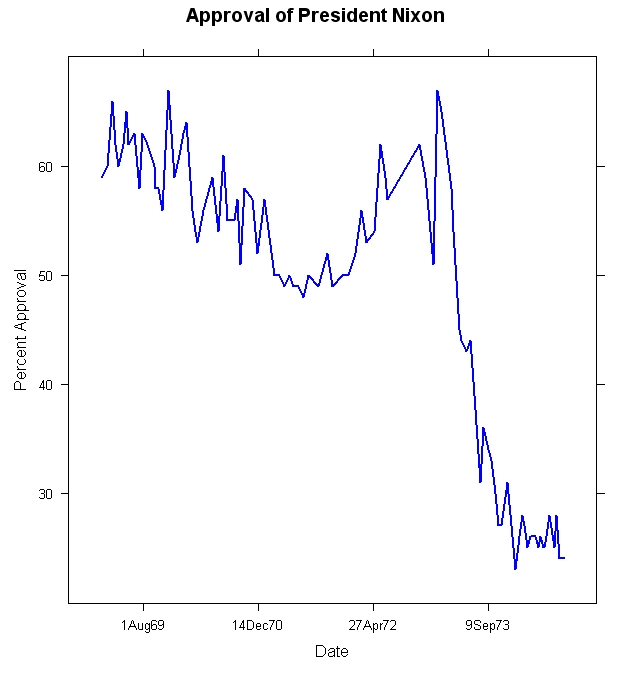 The previous example was not entirely data sonification; the data source itself was sound. Let's look at an example where numeric data is converted into sound. The chart below shows the approval ratings of President Richard Nixon until his dramatic resignation from the presidency.