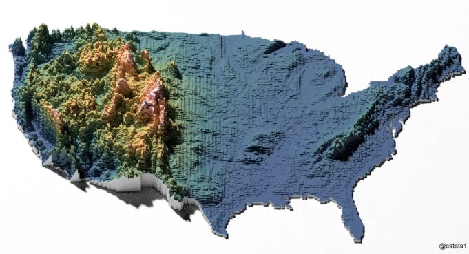 I also love compulsively staring at the flight map while traveling. And in doing that, I discovered something fascinating about American topography: most of the eastern part of the country is really flat! I live in Chicago and can confirm—there are no meaningful gradients around me, just endless flatland. The central part of America where the mountainous region starts (officially called the Intermountain West) begins in Colorado and a few other states. And guess where Denver is?