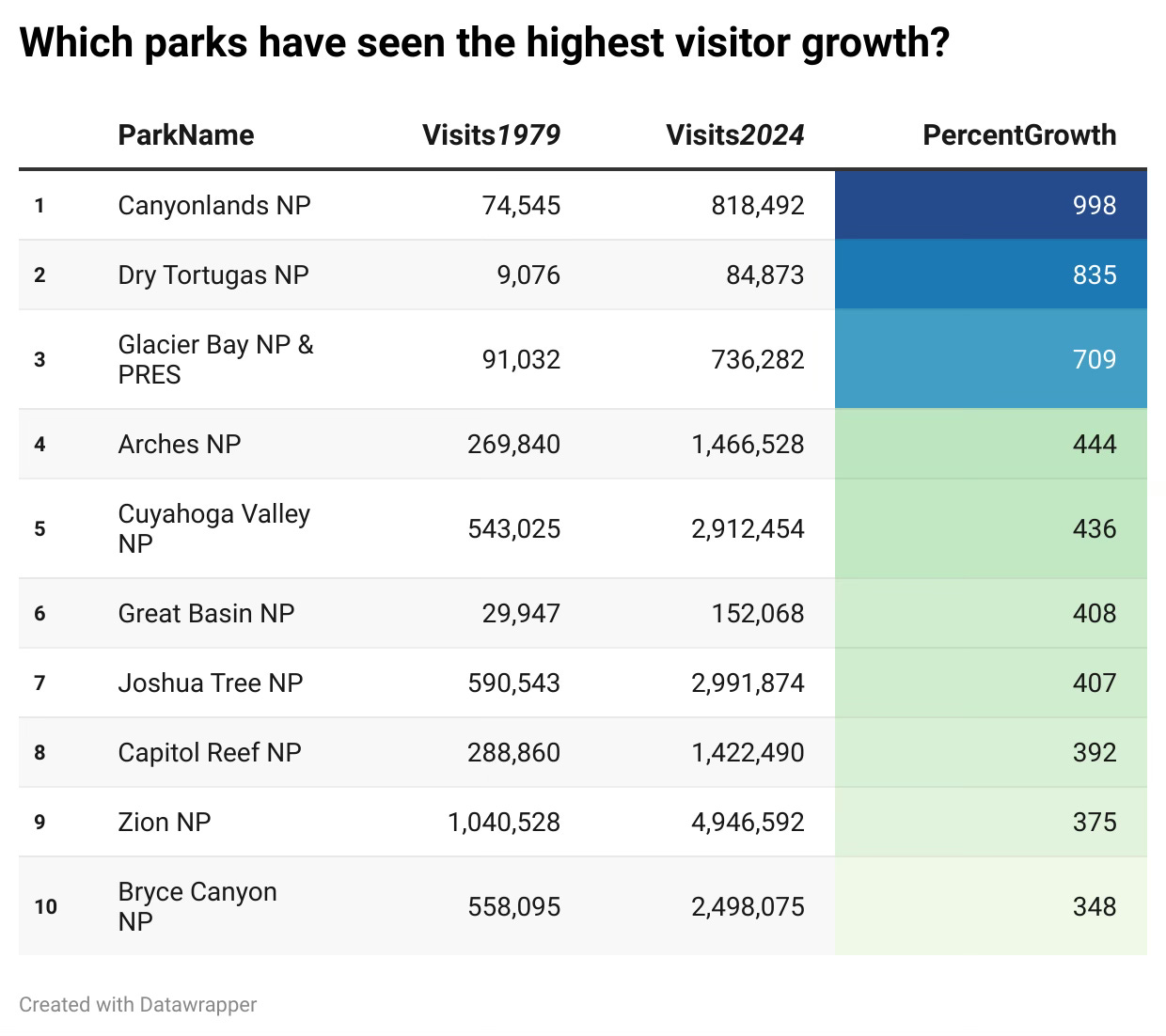 Now, let's see the National Parks which have the highest percentage growth in visitations (from 1979 to 2024). The percentage is a good way to describe this change, But we need to be cautious here: this kind of analysis is prone to low base bias. A park that had very few visitors in 1979 might show a huge percentage jump even if the absolute increase is modest. So while the growth rate tells a compelling story, it’s important to pair it with context i.e. where the park started and where it is now. The ones which are in bold such as Arches, Joshua Tree, Zion had a high enough number of visitors in 1979 and also achieved a high growth in visitors.