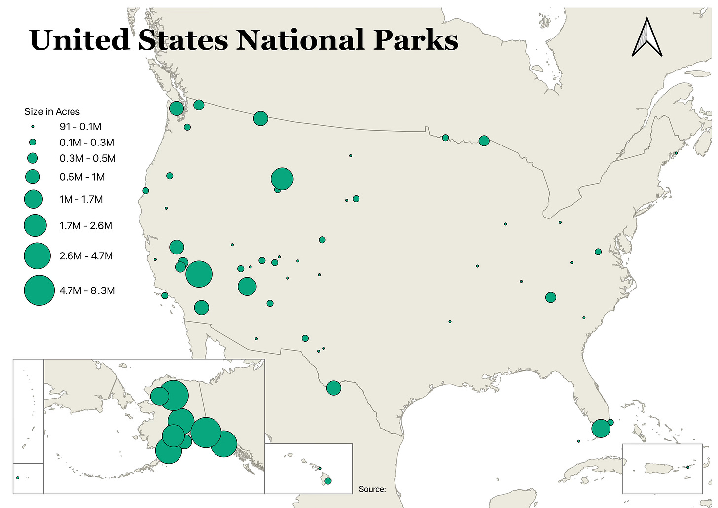 Let’s start with a map of all national parks in the US, scaled by size. I made this in QGIS which is one of the most fun tools for mapping. It doesn’t require coding; it’s mostly clicking, formatting, and layering. Think of it as a complex version of MS Paint meets Excel. You can already see a pattern if you compare this map to the topographical one: most of the larger parks are in the Intermountain West. And what’s going on in Alaska? Into the Wild much?