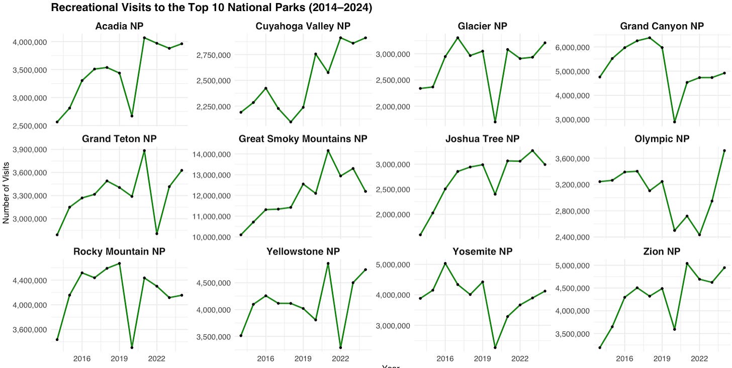 Next, I explored the most popular national parks and how their visitations have changed over the past decade (2014–2024). Many saw steady growth until COVID-19 hit. Some iconic parks like Yosemite and the Grand Canyon still haven’t returned to pre-COVID levels. But others have exploded in popularity post-pandemic—Great Smoky Mountains, Olympic National Park, Acadia, Zion.