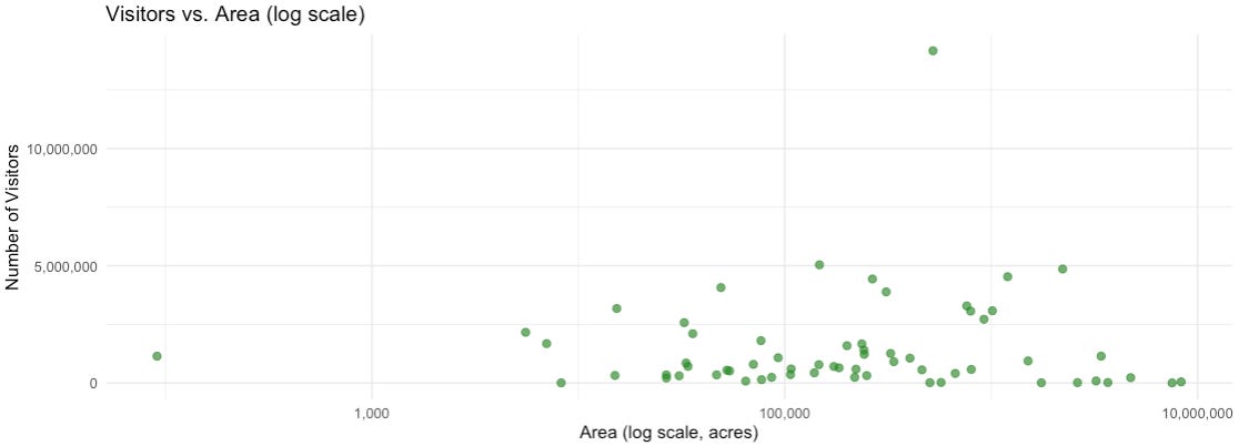 Looking back at the first map, the variation in park size is striking. It made me wonder: does size correlate with popularity? The bigger the park, the more nature it offers; mountains, valleys, waterfalls. Surely that would mean more visitors?